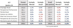 Após cinco meses abaixo da média brasileira, o índice da Intenção de Consumo das Famílias (ICF) no Paraná voltou a superar o indicador nacional. O levantamento é feito pela Confederação Nacional do Comércio de Bens, Serviços e Turismo (CNC) e pela Federação do Comércio de Bens, Serviços e Turismo do Paraná (Fecomércio PR). Com 109,3 pontos, o ICF paranaense teve aumento de 4% em janeiro na comparação com dezembro. A pontuação nacional ficou em 105,9 pontos, com queda de 0,5% na variação mensal.